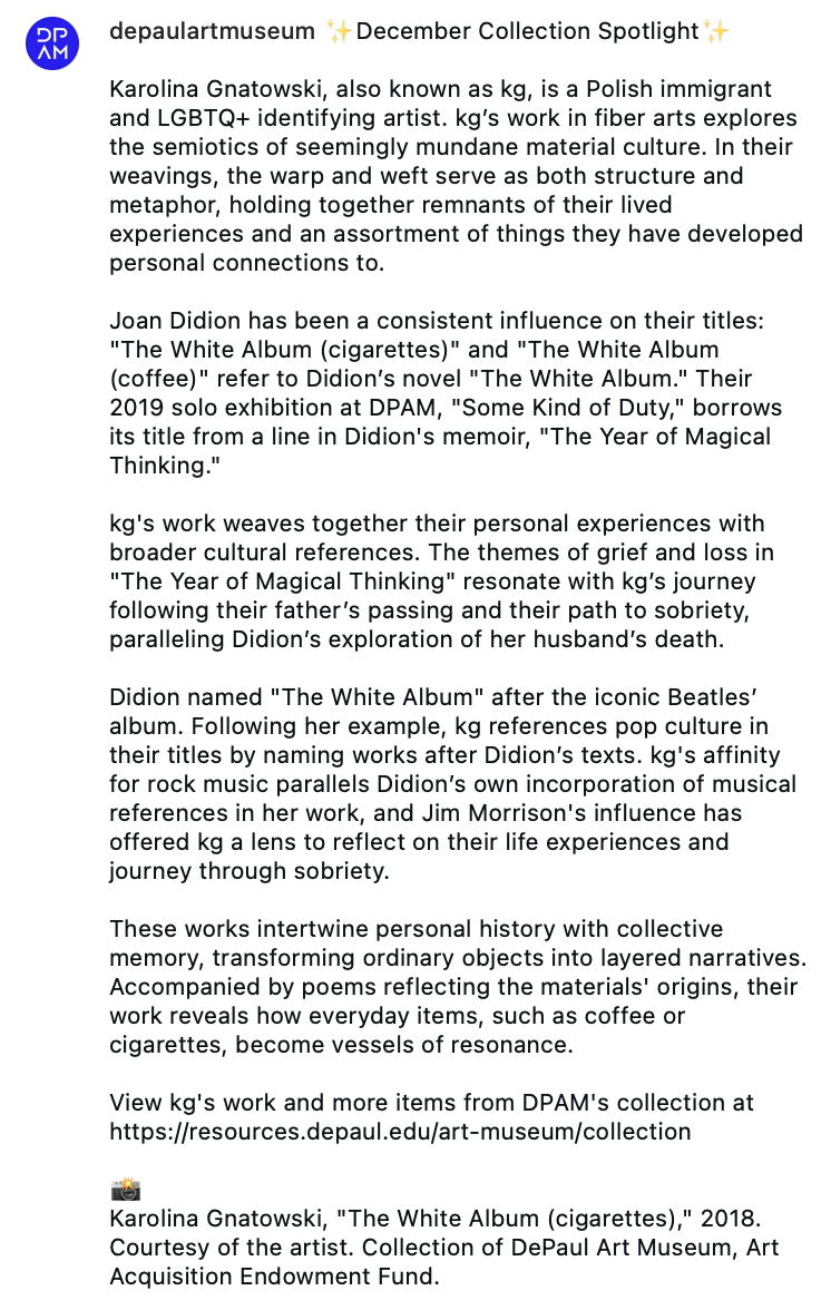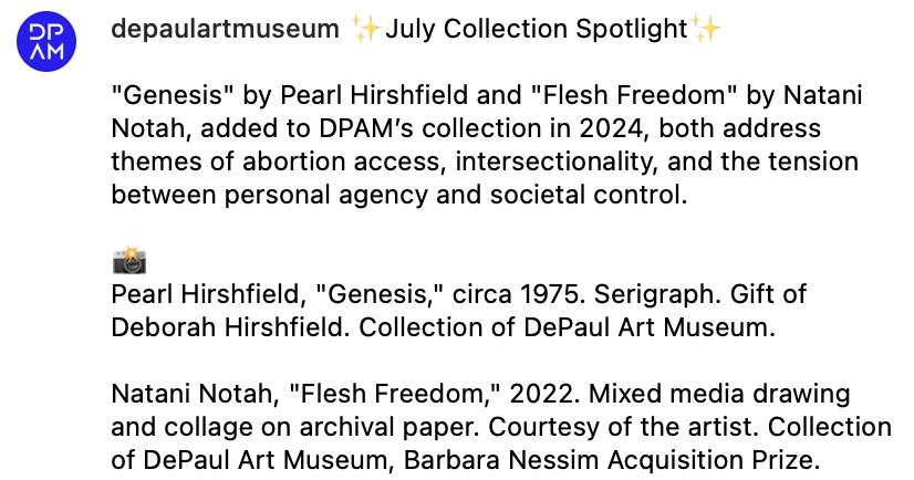 For DPAM’s monthly Collection Spotlights, I selected pieces from the museum’s collection in CatalogIt and tailored content for both Facebook and Instagram. I applied graphic design skills to reformat visuals, ensured messaging aligned with DPAM’s mission, and maintained an authentic, engaging voice guided by the principle “show, don’t tell.” I also gained experience using Buffer to draft, organize, and share content collaboratively with my supervisor.